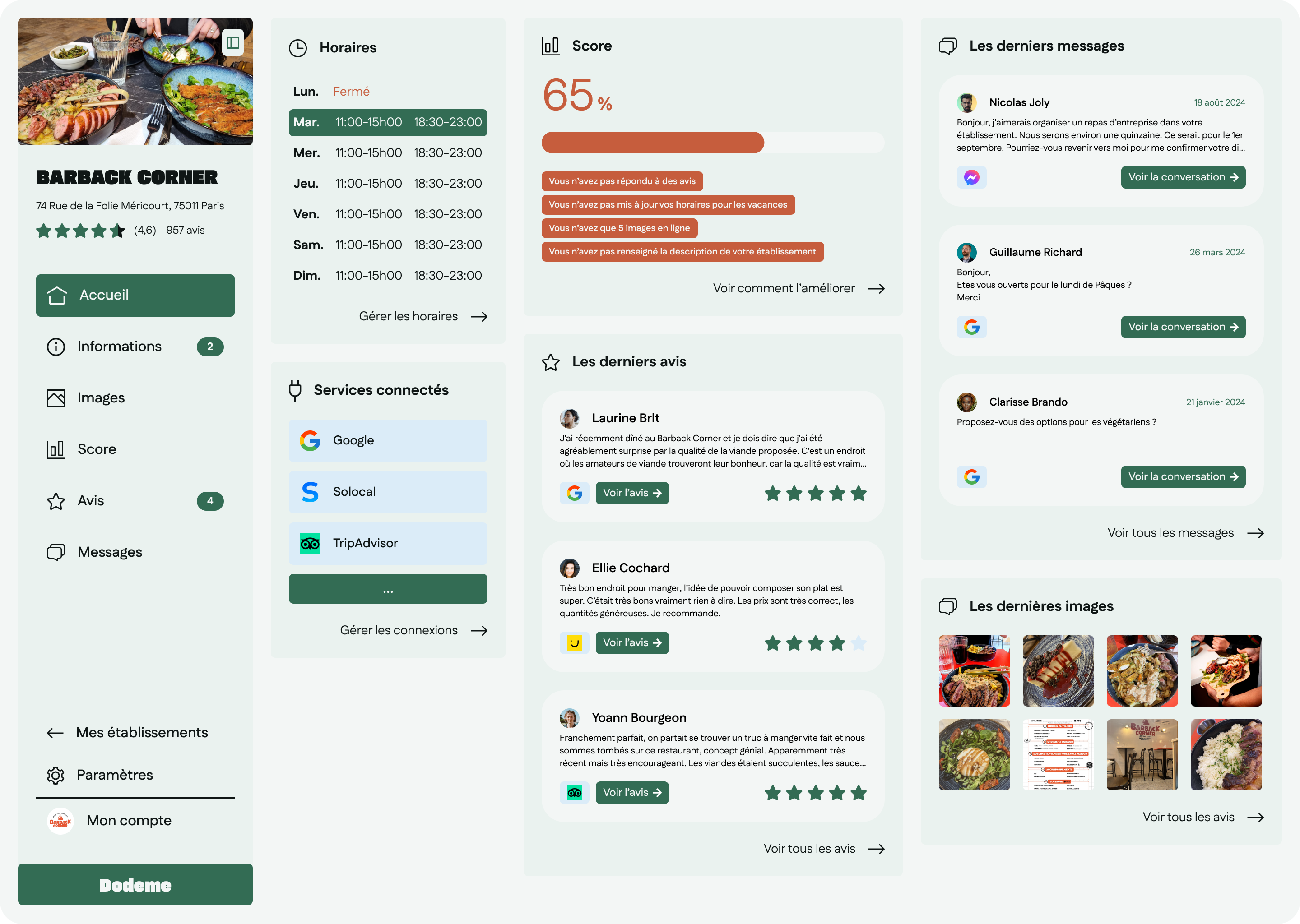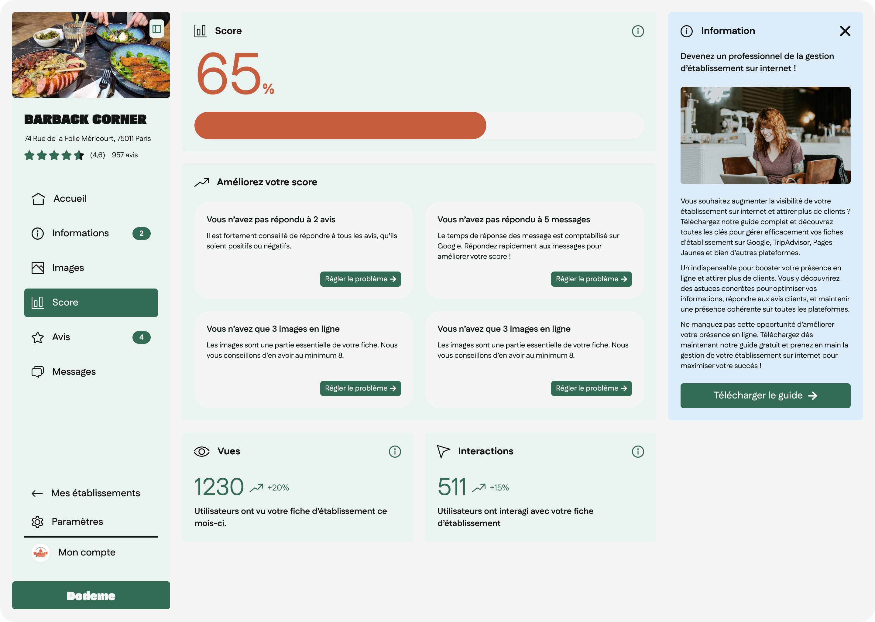 Grâce à ce score, vous bénéficiez de recommandations personnalisées pour améliorer vos performances. Que vous souhaitiez optimiser votre profil Google, augmenter votre visibilité sur TripAdvisor ou renforcer votre e-réputation, cette fonctionnalité vous guide vers les actions à entreprendre pour maximiser votre score. Vous pourrez ainsi suivre vos progrès et mesurer l’impact direct des changements apportés à votre stratégie de gestion en ligne.